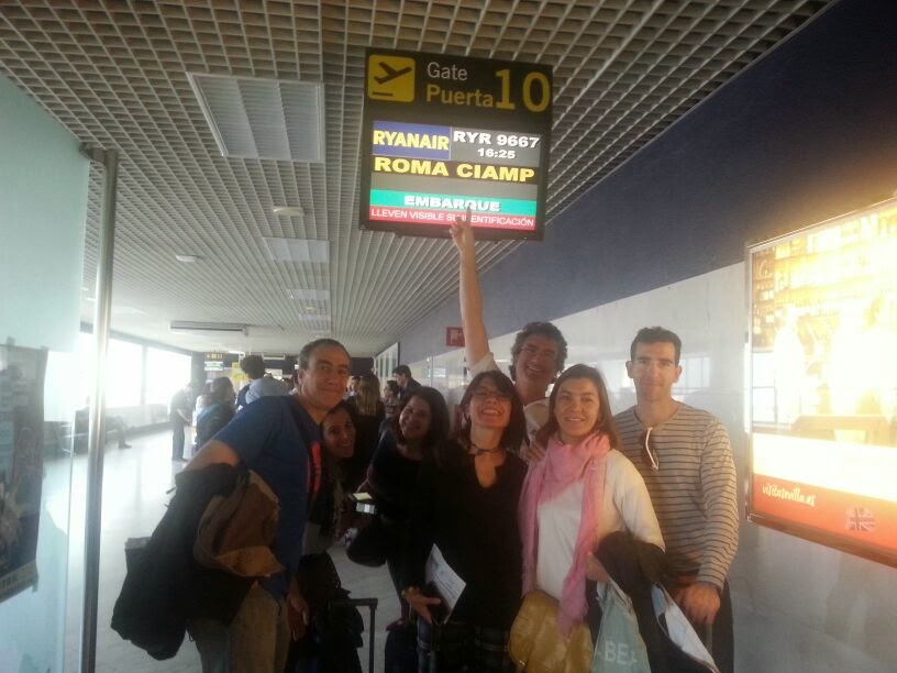 Saludos al makina de Luis, una hora menos que nosotros, a Pastora, y a la ducha... saludos al Supi... y andando pa Termini que se nos iba el traslado, y bueno no se fue porque no salió...así que bocata en el Spar pa quitá el sentío y en taxi al aeropuerto, 30 pavos y como unos señores... Aeropuerto es igual a cola, embarque, cola, espera, cola... y a roncá camino de Hispalis...